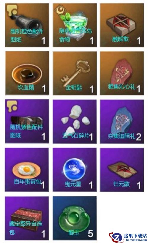 二、额外奖励:随机橙色配件图纸、随机橙色西岛食物、融能散、坎血精、金钥匙、雅集沁心礼、随机紫色配件图纸、五气石碎片、杂集追陪礼、百年蛋荷包、曳元星、归元散、藏宝图•异自选包、靛玉。
