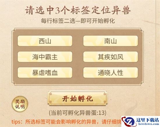 1.点击活动这里的孵化异兽,需要选择三个标签来影响孵化的异兽类型。
