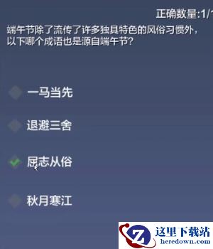 3、端午节除了流传了许多独具特色的风俗习惯外,以下哪个成语也是源自端午节?正确答案:屈志从俗