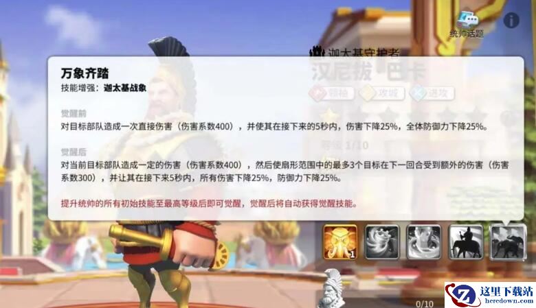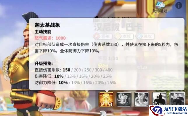 这个角色的主动技能为迦太基战象,可以对敌方单体造成伤害,同时5秒内减少25%的伤害和防御。