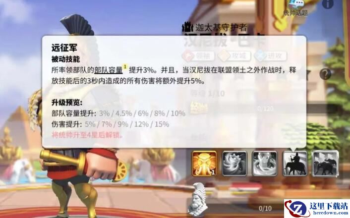 让部队的容量提升10%,当在外战斗时可以增加15%的技能伤害。