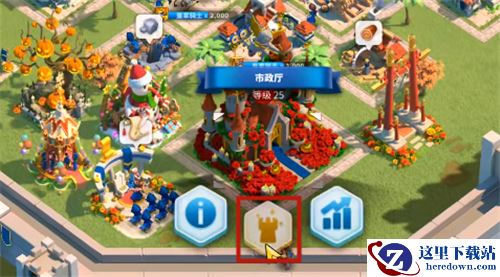 1、玩家进入游戏后,在大厅内选择市政厅建筑,点击中间黄色塔楼图标。