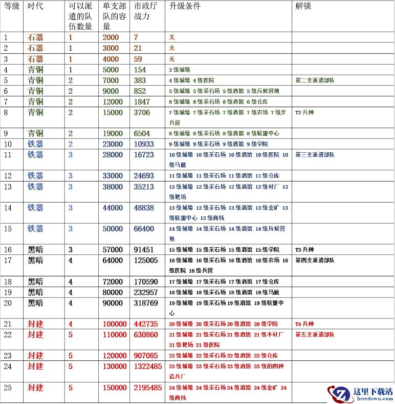 随着派遣队伍数量的提升(最多五支部队),大家采集的效率也会越来越高!每天更多的资源收入意味着更快的游戏进度!其次,市政厅等级越高也意味着单支部队的基础容量也会越高,在前期战斗时也是一种优势!