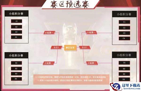 预选赛阶段:预选赛会时间将会持续五周,并且每个战区会分成32个赛区,每个联盟会打三轮小组赛,其中小组第一将会出线,继续打两轮淘汰赛,最后决出每个赛区的区冠军,共计32队参加季后赛