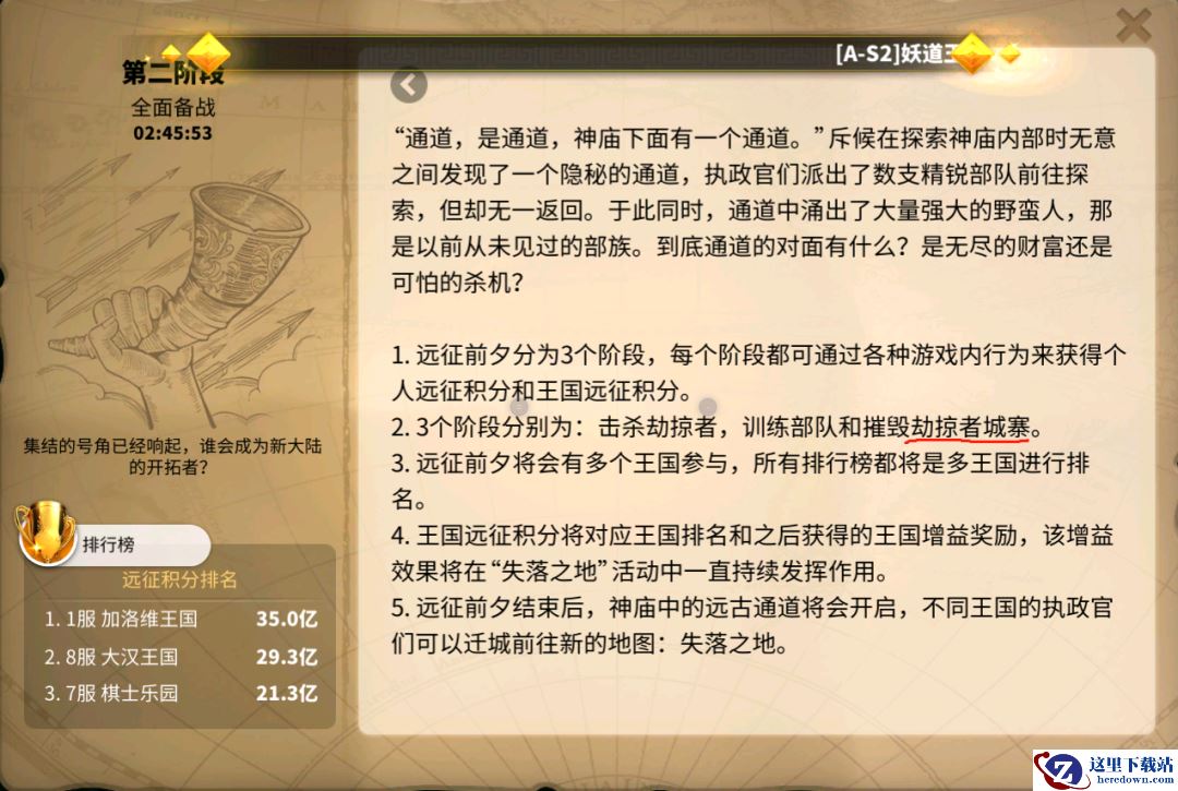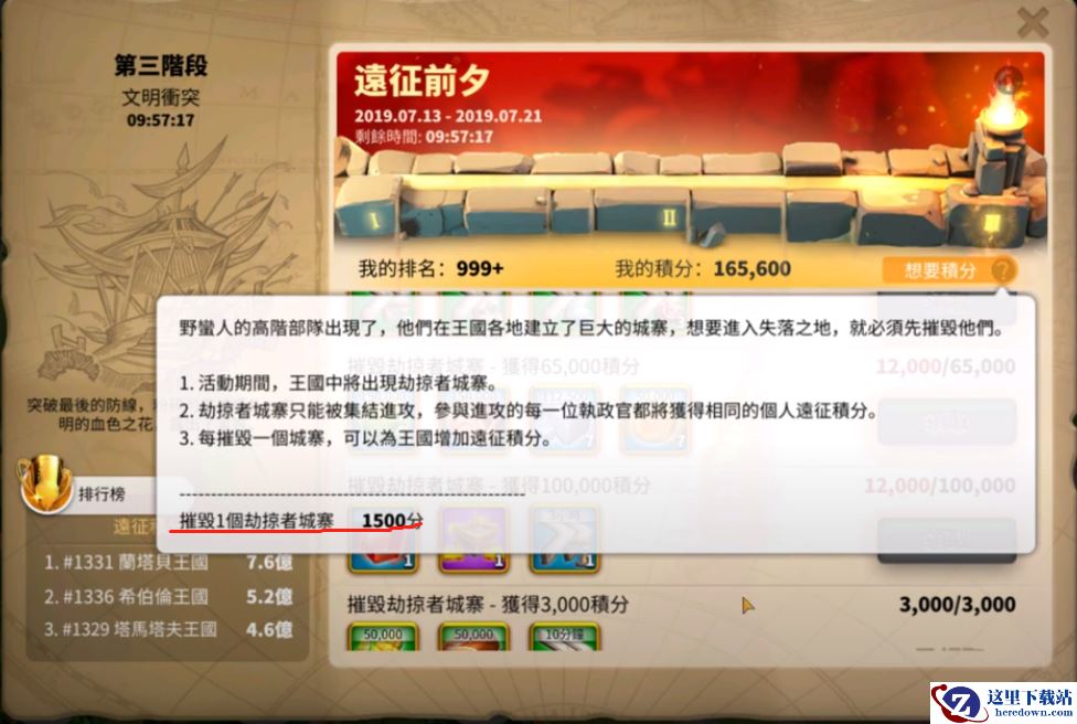 刷劫掠者城寨。劫掠者城寨只能集结,参与攻击的每一个位执政官都可以获得相同的远征分数。每摧毁一个城寨,可以为王国增加远征积分。