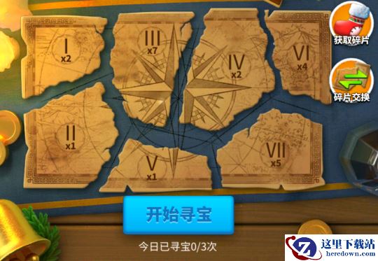集齐7张不同的藏宝图碎片可以得到1张完整的藏宝图。藏宝图上绘制了宝藏所在的地点,根据藏宝图即可寻找宝藏所在位置。