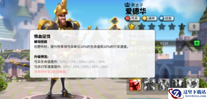 在野外时,提升所率领弓兵单位30%的生命值和30%的行军速度。