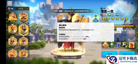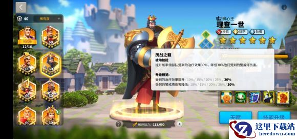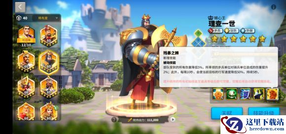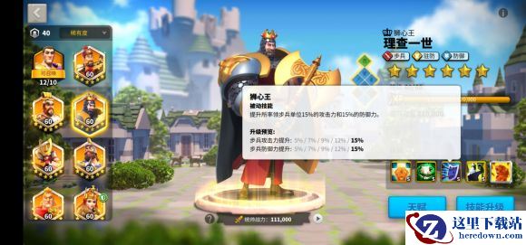 理查一世是玩步兵一定要培养武将,关于5511、5551和觉醒,小编推荐大家觉醒,回血还是很厉害的,如果金头有限,最低扔个5551,坦度可以上来,至于5511因为他不像查理5511就能满足,所以推荐5551到觉醒。