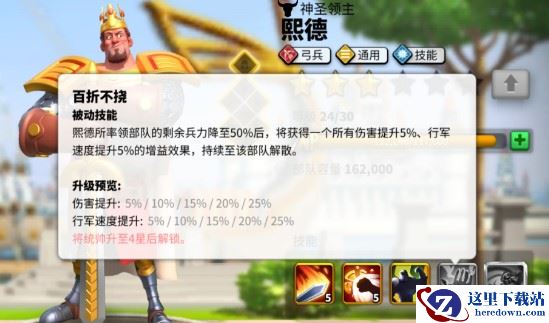 4、百折不挠:半血以下增伤(5/10/15/20/25)%,行军速度加(5/10/15/20/25)%