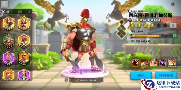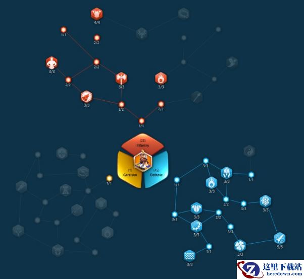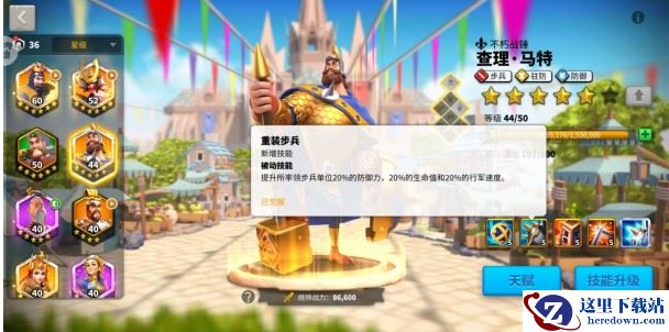 重装步兵(被动技能)(浴火重生(觉醒)):提升所率领步兵单位15%(20%)的防御力和生命值,(提升所率步兵单位20%行军速度)