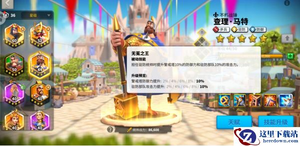 无冕之王(被动技能):担任驻防统帅时提升警戒塔10%的防御力和驻防部队10%的攻击力。