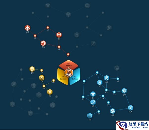 驻防:驻防更多时候并不是用于保护自己的城市,由于城市可以开保护盾获得无敌的效果,在游戏里,驻防更多的是用于守联盟的旗帜和要塞等。因此我们并不需要提高警戒塔的能力,也就不需要选择增加警戒塔属性的天赋。由于驻防时,我们很难控制联盟的成员是否会使用纯兵种驻防,所以步兵天赋反而作用不大,而防御天赋会更加有效的提升查理马特驻防的能力。