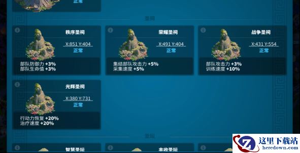 由于受前置纪念碑任务的影响,准确时间各个王国可能不同。圣祠总共有四种,分别为:秩序圣祠,荣耀圣祠,战争圣祠和光辉圣祠。具体的增益效果见下图所示,每种类型的圣祠效果是不能叠加的。