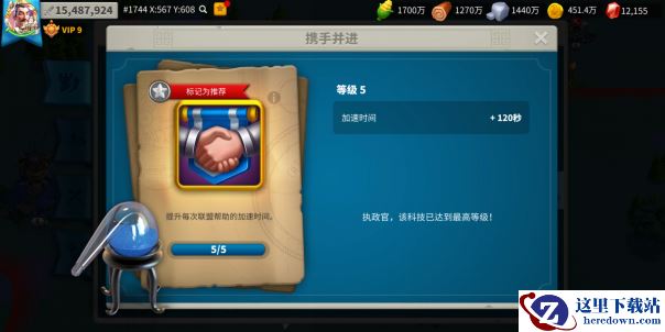 携手并进:提高联盟帮助的最少加速时间,点满这个技能后,联盟最少的帮助时间一次为3分钟。在前期,许多东西升级所需要的时间很短,甚至很多情况下只需要帮助被点满,你的建筑或者科技就升级完了,这可以大大提高联盟成员的发育速度。
