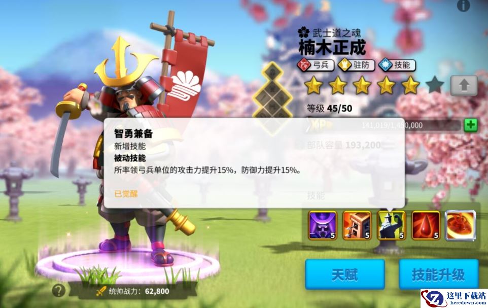 觉醒技,武魂:加强的三技能,把攻击力,防御力属性提高到了15%,很好的提高了弓兵部队攻防属性。