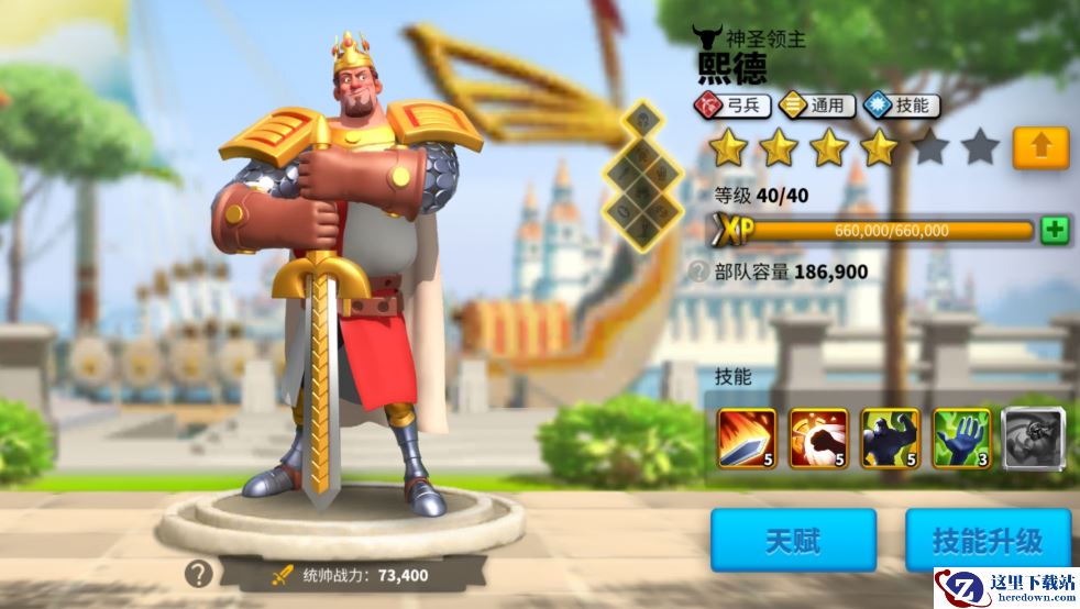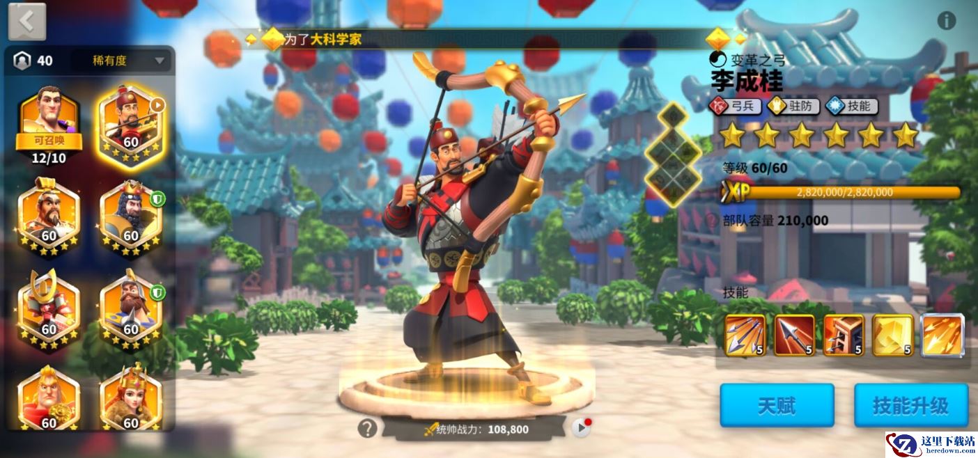 三技能,智勇兼备:提升弓兵部队10%的攻击力和防御力(未觉醒)。一般弓兵都是爆发高身板脆,这个防御属性很棒。