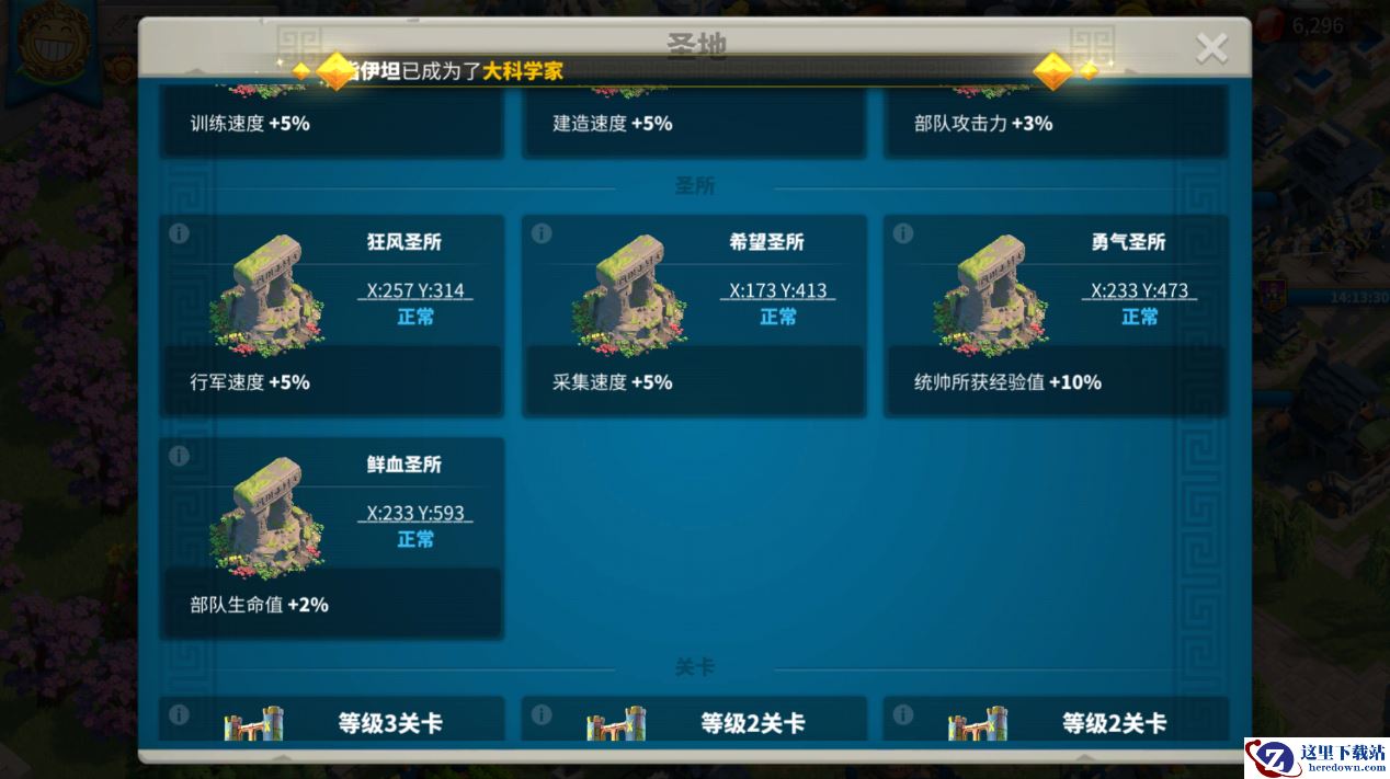 圣所首次占领有500宝石和迁城等道具,对于前期来说比较有用,所以一定要拿首占。圣所大约会在王国历史第5天开放,由于开放时间非常早,所以攻占难度非常低。