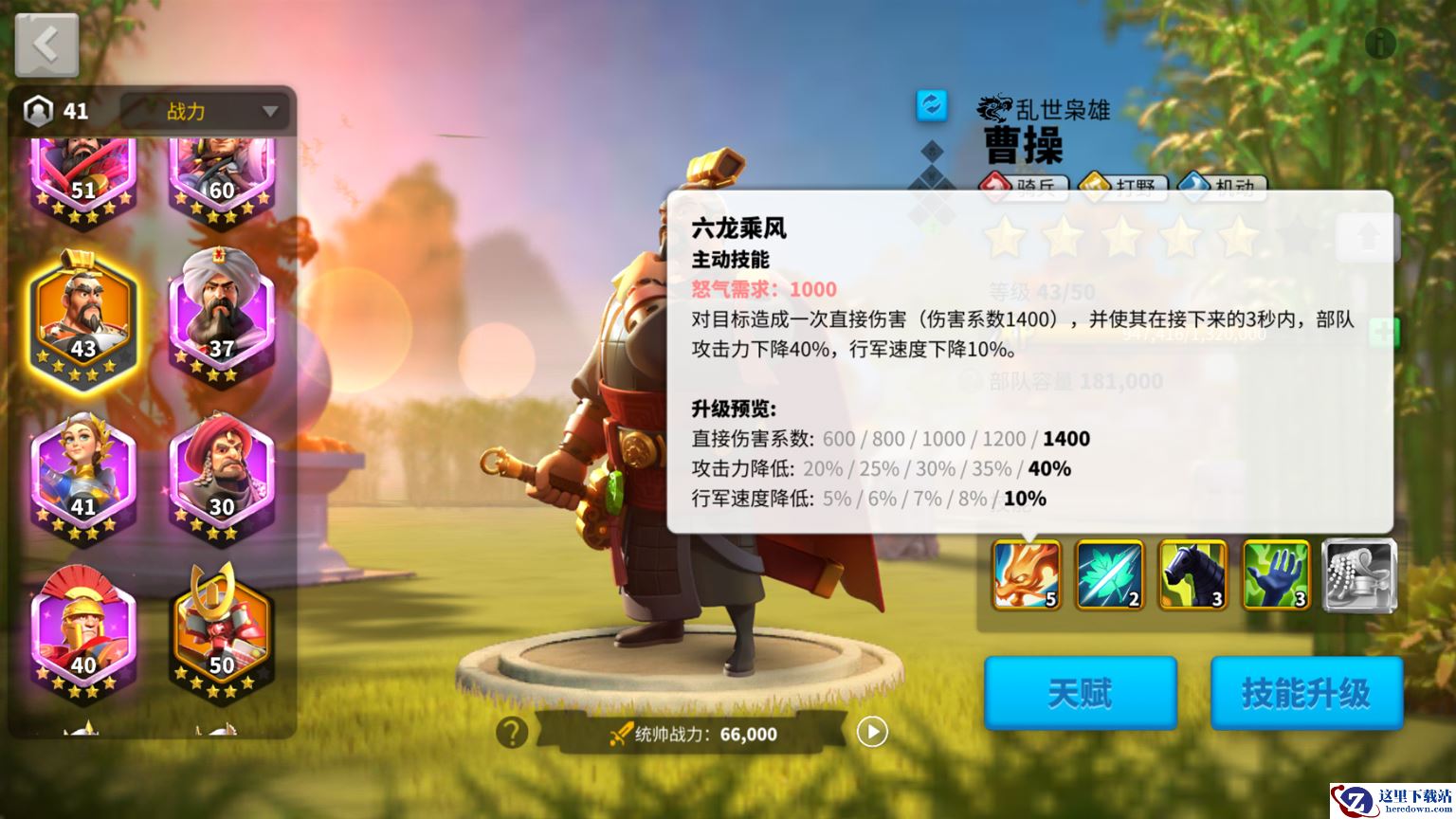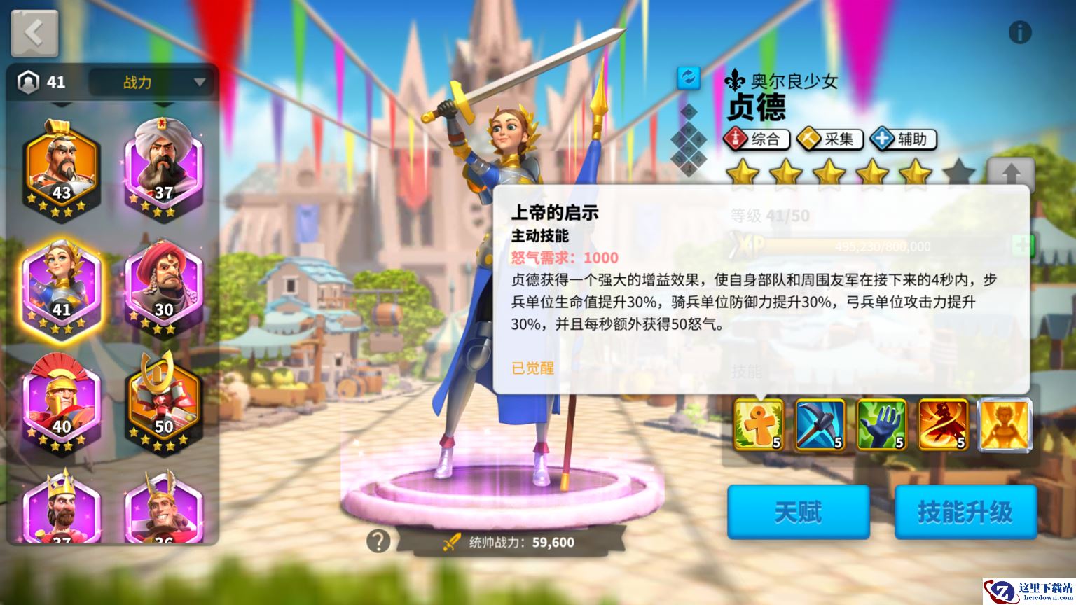 源义经获取门槛非常低,首充就可以获得,并且可以轻松将一技能升到五级,曹操可以从宝箱获得,两个将领的一技能伤害在前期非常可观,加上被动对骑兵攻击的加成和野蛮人的增伤,伤害爆炸。此外曹操一技能还能降低40%的对方攻击力,并且有几率回血,提高了生存能力,在满编T2或者T3T2骑兵混编的情况下,轻轻松松就能拿下圣坛。