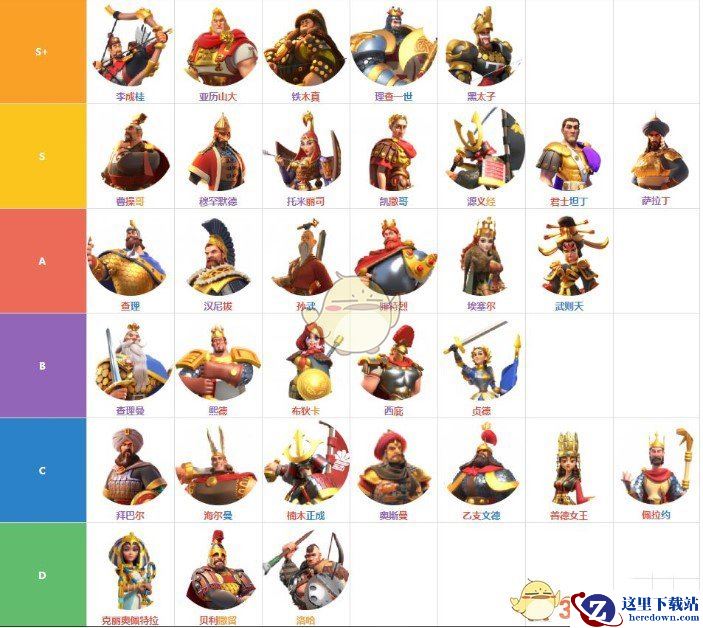 S+为评级最高、D为最低。名字有对应的定位颜色,分别为:『集』集结城市或据点、『战』野战、『守』守城、『野』打野。同一评级没有先后之分。