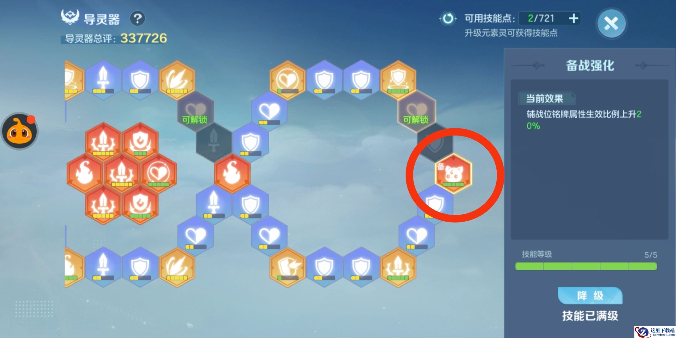 导灵器没有点到最右边备战强化满级不要投入太多资源弄辅助元素的铭牌,辅助位元素铭牌在前期可以弄个10来级凑一套最低品级的词条就停下来,资源主要弄主元素铭牌,直到你导灵器点满备战强化节点再考虑弄辅助元素的铭牌。