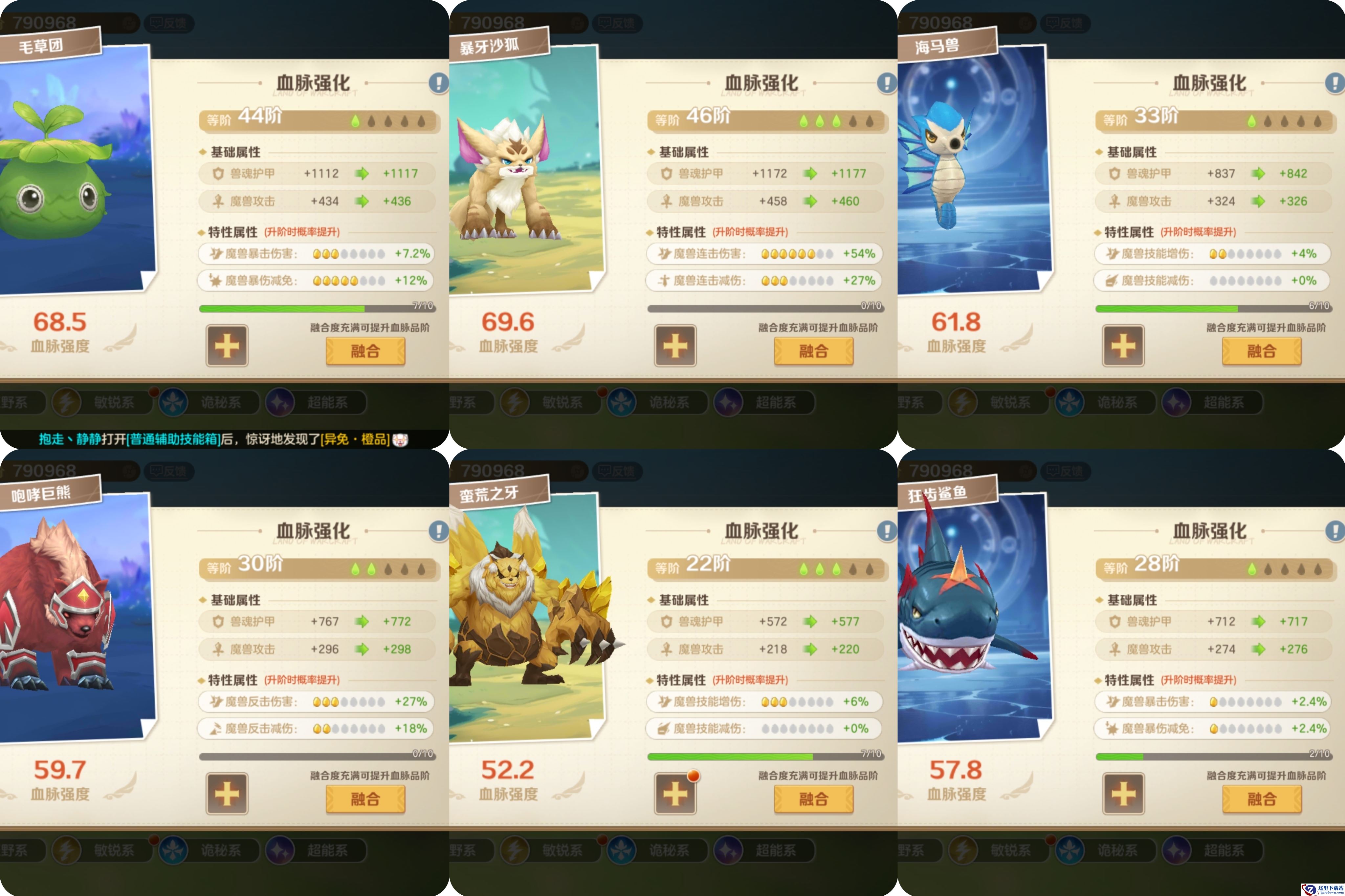 总结:现在抓魔兽限制数量以后,其实已经不肝了,魔兽岛可以用小号堆出多条线路,闪光基本抓不完,异色可以挑着抓,闪光异色依旧抢手,没有中高级魔兽球的小伙伴每天抓两个以后就可以停手了,有高级球可以多抓几个,初级球多的抓闪光和异色抓到成功率降低35%以后也可以休息了,魔兽的血脉融合是一个长期工程,不可能一步到位,考虑到成本和肝度,按照个人情况自行调整。