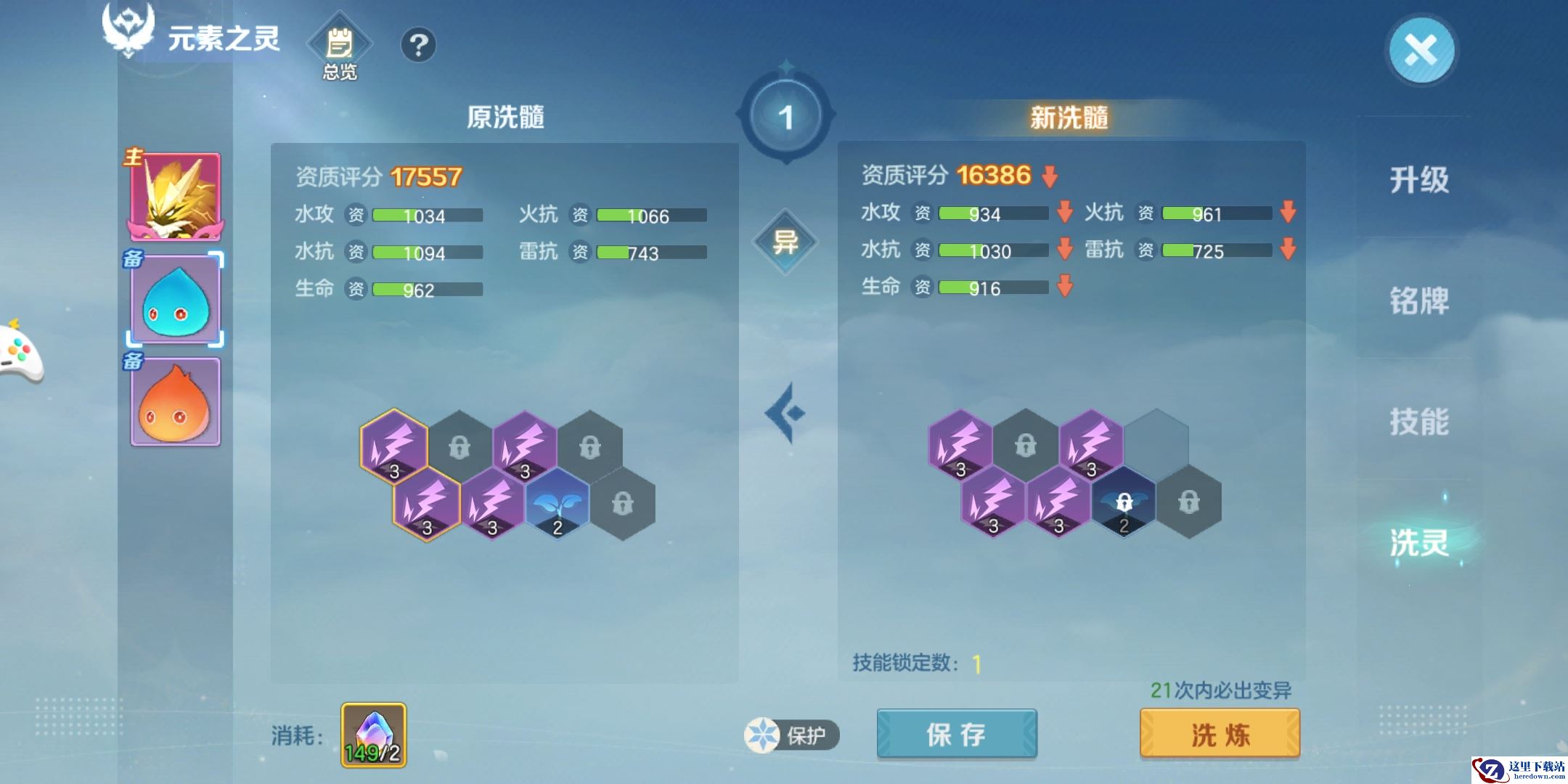元素每次洗灵都有概率出变异资质,当洗灵等级提升到固定等级15级和满级40级,每次洗灵都是必出变异1阶和变异2阶。变异资质的好处有很多,最基本的就是变异后资质会有大幅的提升,元素初始攻击,抗性,生命倍率会有大幅提升(同等洗灵等级的条件下,变异和非变异的区别),另外一方面变异资质灵决技能空格会比非变异资质要多。