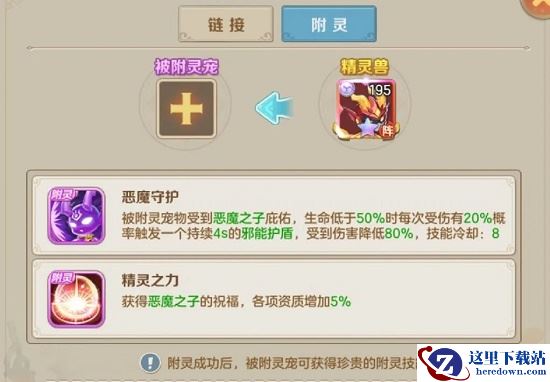 附灵,精灵兽可附灵到任意宠物上,被附灵宠将获得2个附灵技能,附灵状态可以随时解除。