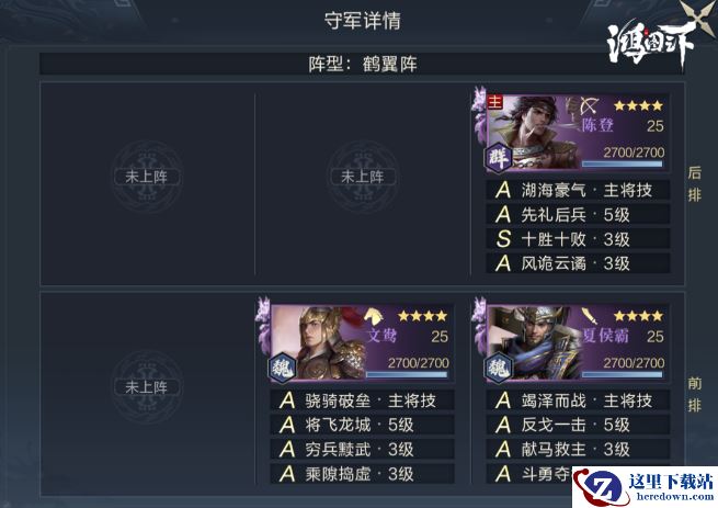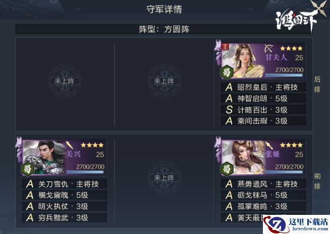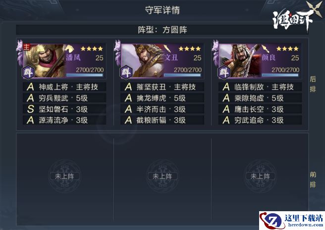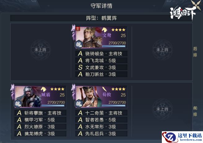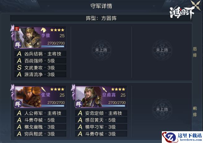 图中站位以飞狗队(张飞、荀彧、主公)为示例,前排站位为主公,后排站位为张飞与荀彧(特殊情况下坦度最低的荀彧会单独站位,规避战损),五级地的主要难度参考在于敌方主将站位(爆头难度),敌方主将技能两方面,技能克制需根据个人开荒队的情况为准。