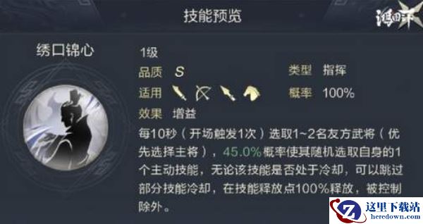 1、能减少友方2名武将随机主动技能的10秒时间,无论友方武将技能是否在冷却,都可跳过此冷却时间,除非俩名友方武将被控,无法释放主动技能