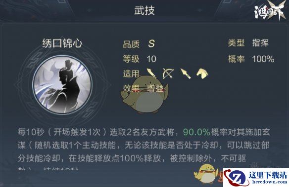 绣口锦心提供的玄谋状态是S4中新加入的技能状态,该状态能随机选择1~2个友方武将(优先主将)携带的1个技能,让这个技能下次发动时必定成功,并会跳过该技能一部分冷却,对输出武将的技能发动效率提升帮助非常大,可以改变技能的释放周期,关于简雍的深入解读会在之后单独制作攻略为大家分析。