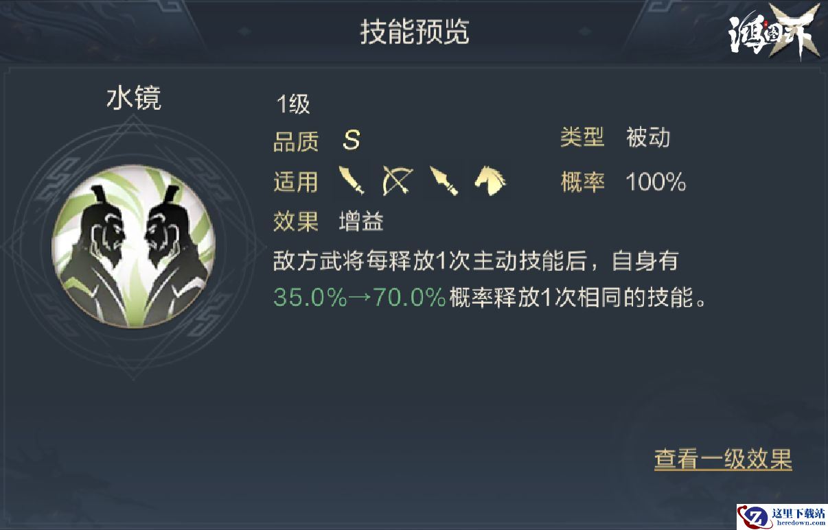 该技能的触发条件被限制为主动技能(不包含主将技),无论是武力类还是智力类技能都有概率被复制释放,这里我们就需要考虑3个因素,一是敌方主动技能的发动成功率,二是水镜的触发成功率,三是被复制技能的类型(输出类型、功能类型)。