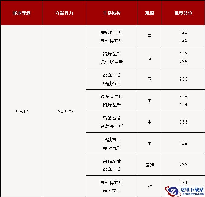 九级地整体而言对法师队比较友好,对连击队限制较大,其中貂蝉队本身的输出并不算太高,但美人计对我方核武的影响很大,荀彧队同理。另外如甄姬、太史慈、严颜都对连击队有较大限制,使用灵帝队开荒的主公尽量避开这些队伍。
