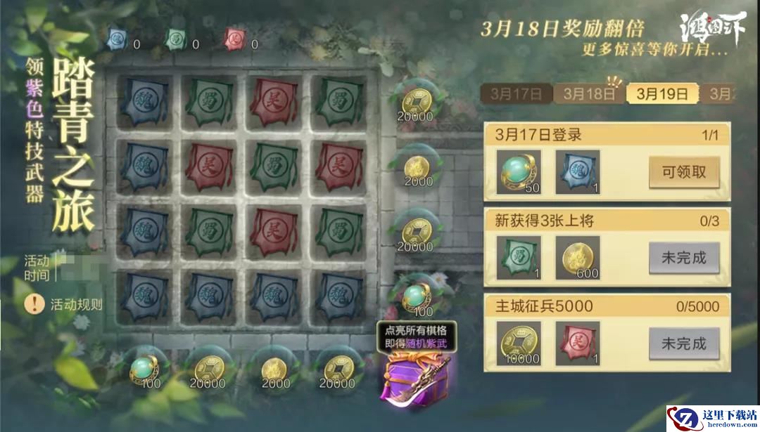 1、 完成指定任务,收集【魏】、【蜀】、【吴】三国“帅旗”点亮鸿图“棋盘”,即可获取铜币、珠玉等奖励;