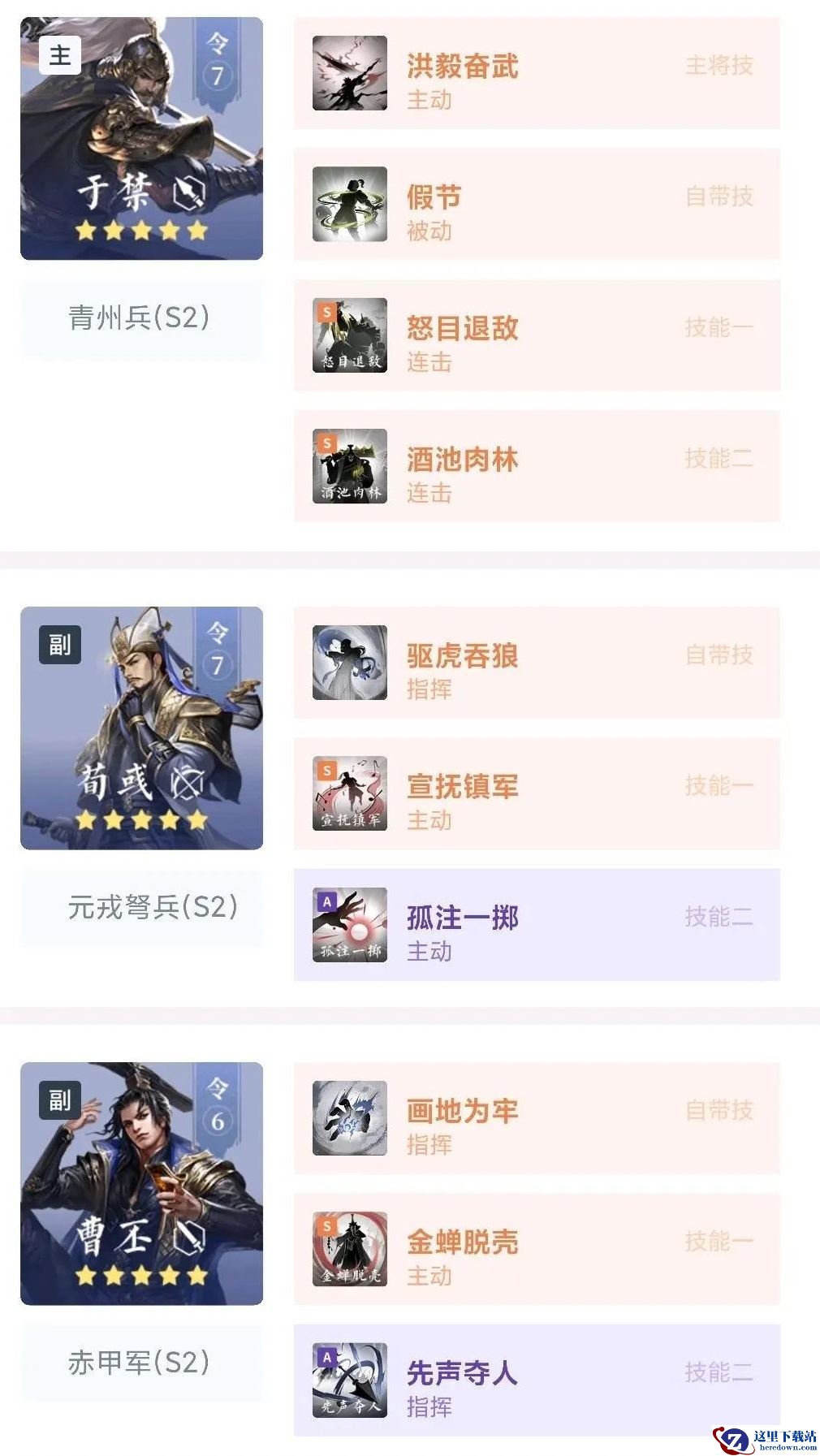 酒池肉林的励军效果正好可以提升于禁的续航,加强存活能力。如果追求极致输出,也可以更换为贯颐奋戟。