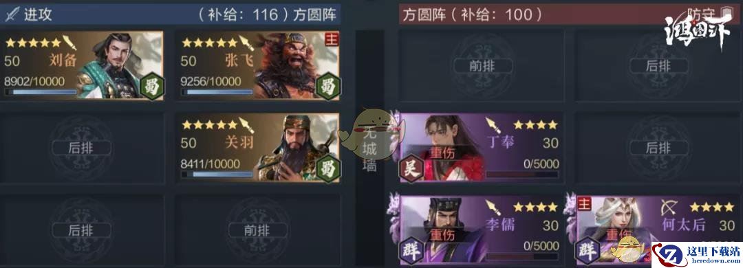 站位也会影响一些技能的效果,如下图这种站位,可以让张飞的辕门射戟准确攻击到敌方最后排主将,并且让关羽成为首要承伤目标。
