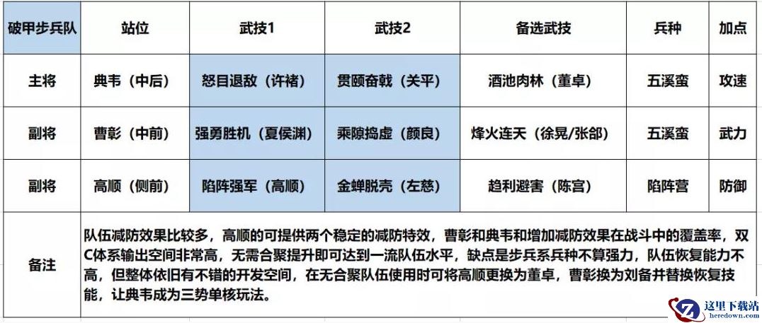 该阵容搭配核心是以高顺的拆解武技为出发点,该武技可以让输出偏低的步兵系武将得到不错的提升效果,同时全队自带励军,有更多空间搭配输出技能。高顺的自带武技可以降低敌方武技带来的队伍增益,同时让敌方武将释放技能后被减防,可以说是步兵队必备搭配核心。