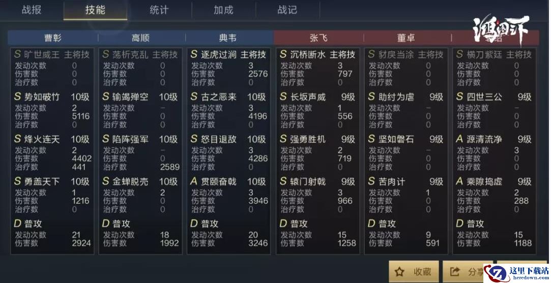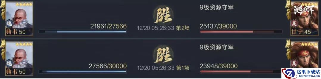 这里以9级地作为测试,第一场仅损失4000兵力便取得了胜利。从战报统计可以看出,典韦与曹彰两个输出核心都造成了巨额伤害。由此可以看出步兵输出队的可行性是非常高的。该队伍更适合于中期交战,当然用于打地也有不错的强度,可以穿9。