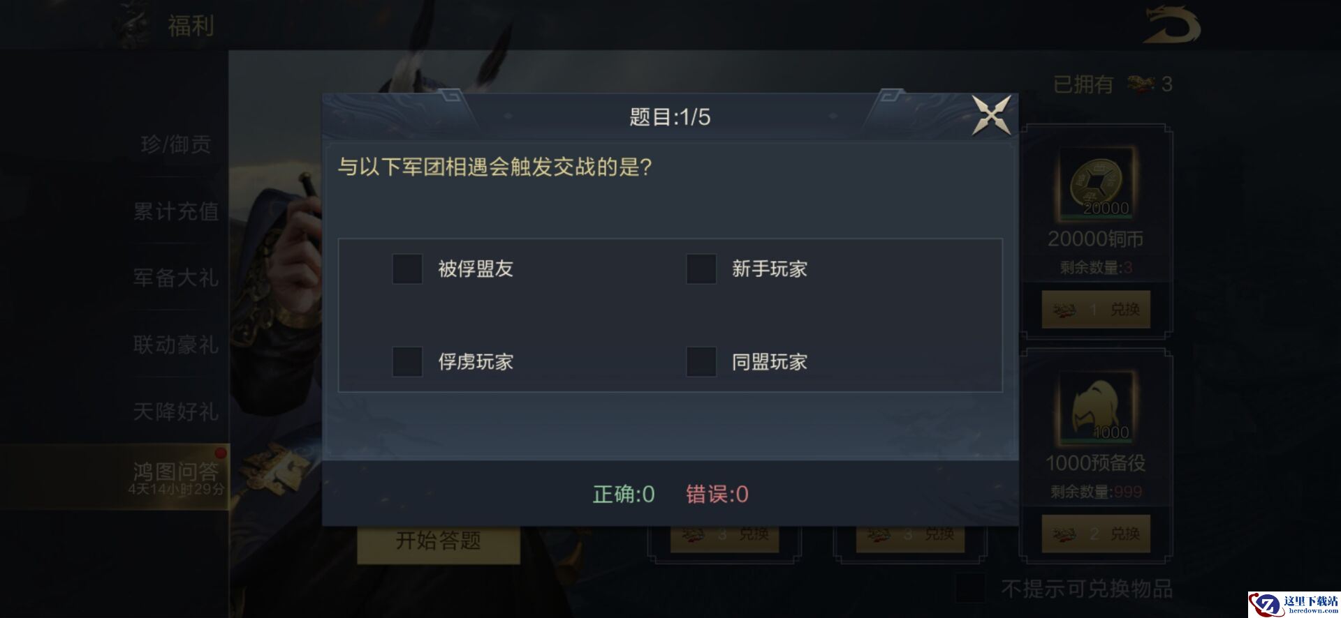 《鸿图之下》手游中新的活动鸿图问答开始了,玩家们要把问题回答正确才能得到相应的奖励。相信还有很多小伙伴不是很清楚【与以下军团相遇会触发交战的是】的答案是什么,下面小编给大家分享一下鸿图之下【与以下军团相遇会触发交战的是】答案介绍,感兴趣的小伙伴们一起来看看吧。