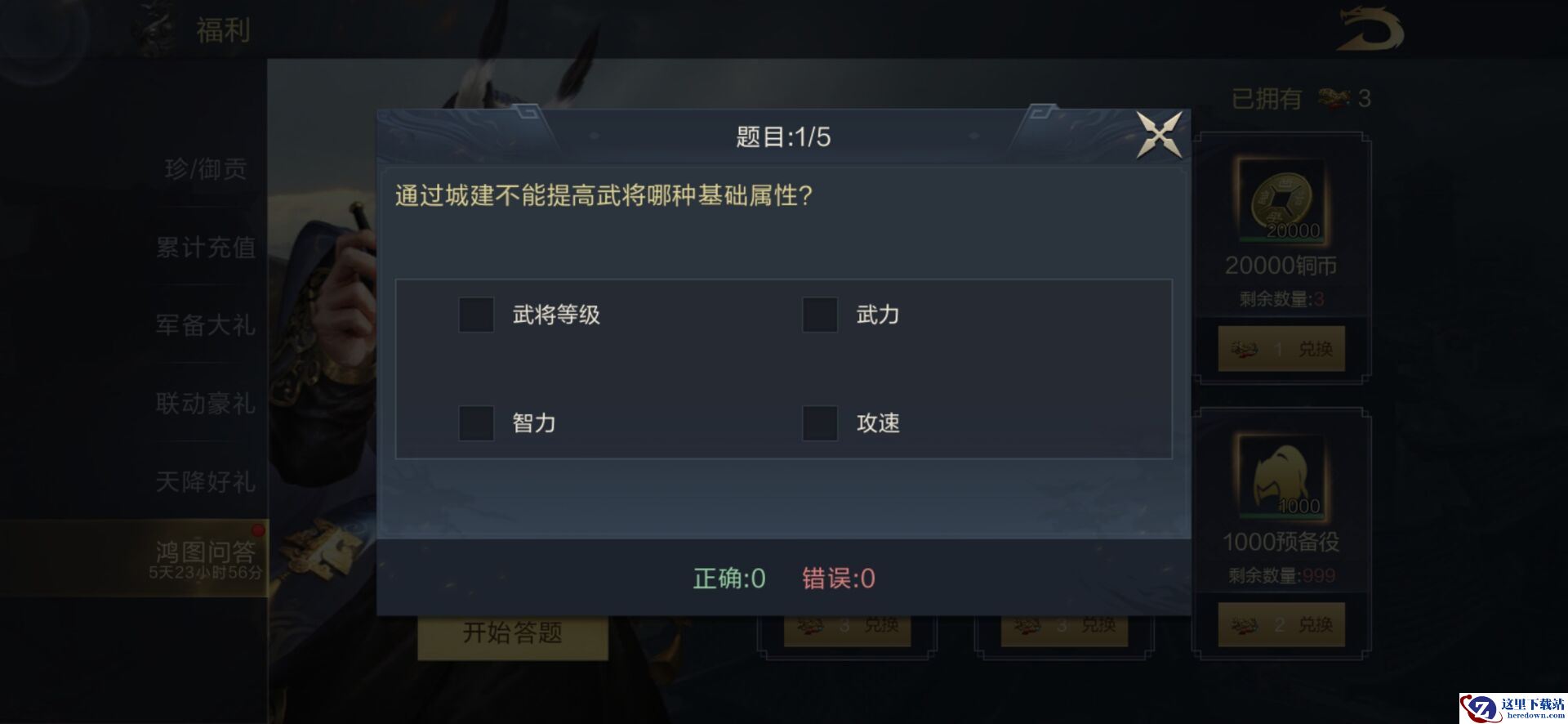 每天可进行一次答题,每次答题共有5道题,答题结束后根据正确题目的数量发放活动道具。没有答对获得1个活动道具,答对1题获得2个活动道具,答对2题获得3个活动道具,答对3题获得5个活动道具,答对4题获得7个活动道具,答对5题获得10个活动道具。