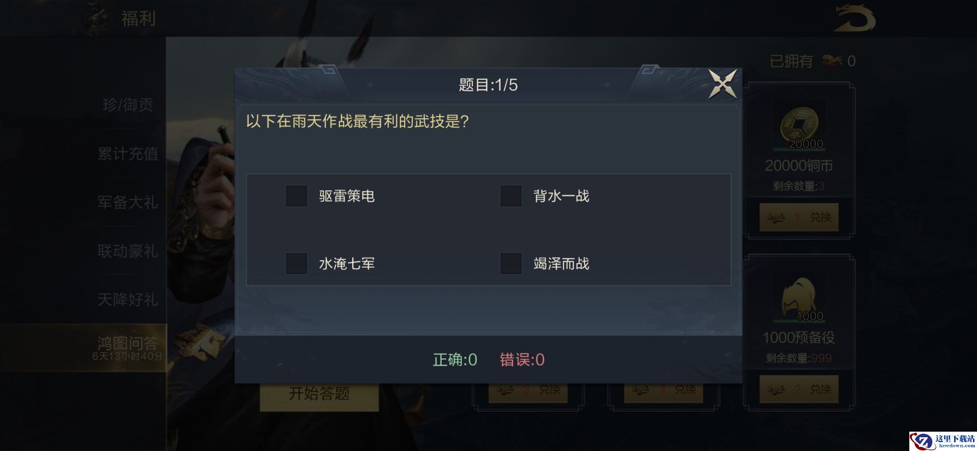 每天可进行一次答题,每次答题共有5道题,答题结束后根据正确题目的数量发放活动道具。没有答对获得1个活动道具,答对1题获得2个活动道具,答对2题获得3个活动道具,答对3题获得5个活动道具,答对4题获得7个活动道具,答对5题获得10个活动道具。