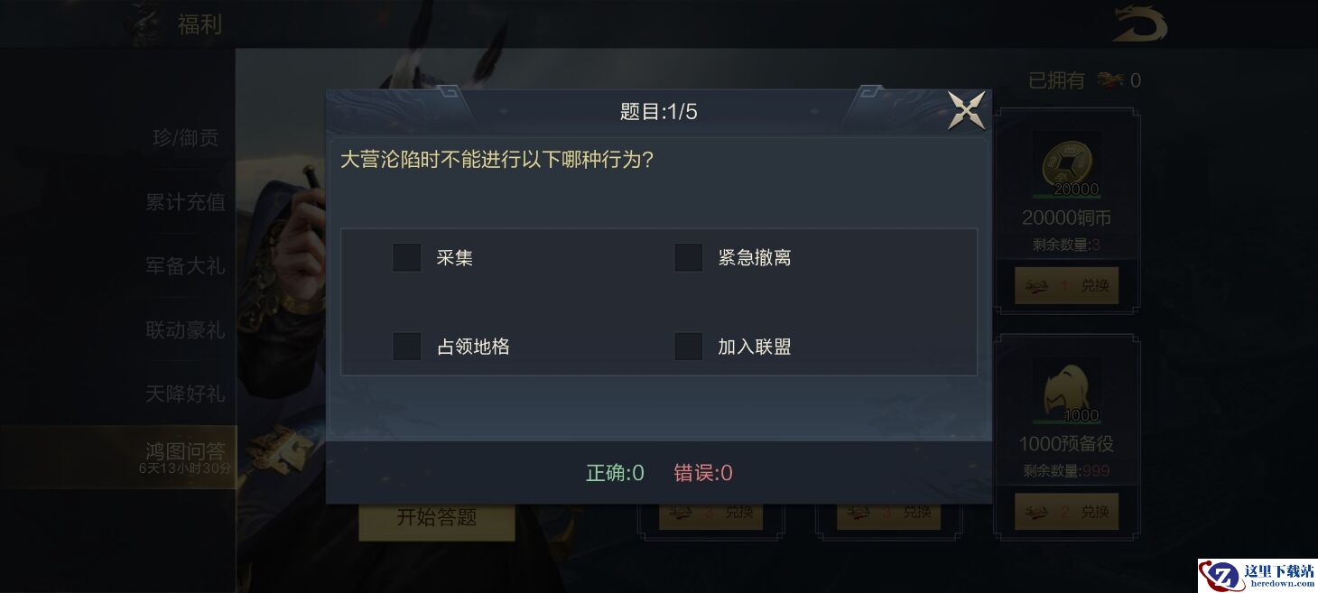 《鸿图之下》手游中新的活动鸿图问答开始了,玩家们要把问题回答正确才能得到相应的奖励。相信还有很多小伙伴不是很清楚【大营沦陷时不能进行以下哪种行为】的答案是什么,下面小编给大家分享一下鸿图之下【大营沦陷时不能进行以下哪种行为】答案介绍,感兴趣的小伙伴们一起来看看吧。