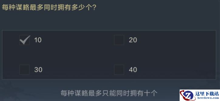 《鸿图之下》手游中新的活动鸿图问答开始了,玩家们要把问题回答正确才能得到相应的奖励。相信还有很多小伙伴不是很清楚每种谋略最多同时拥有多少个,下面小编给大家分享一下鸿图之下问答答案介绍,感兴趣的小伙伴们一起来看看吧。