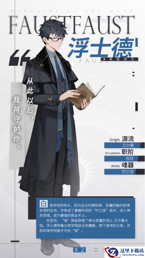 解神者X2浮士德是白夜学院的院长,因为“蚀”降临吞噬了神与恶魔的领土-艾尔慕大陆,浮士德带着白夜学院跃迁到魔都,救下游戏的主角,并和四神学院联手对抗“蚀”。接下来小编为大家带来解神者X2炼金院长浮士德介绍,希望对大家有所帮助。