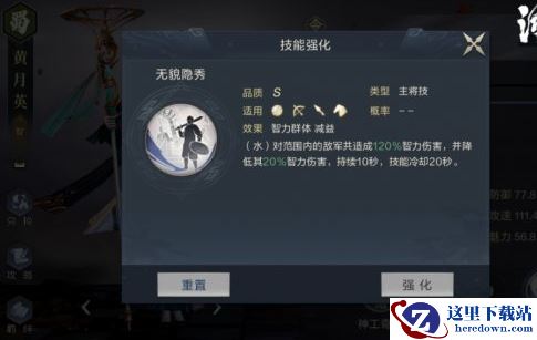 技能介绍:随机降低1名敌方武将50.0(→55.6 )点智力,持续10秒,井对其造成112.5% ( →125.0% )智力伤害,有摄率(目标智力被降低比例越高,控制低率越高)使其眩晕(无法行动),持续10秒,技能冷却10秒。