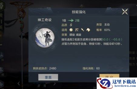 技能介绍:随机选取2名敌方武将分别价取其50.0 (→55.6 )点智力井附加于自身,持续10秒,技能冷却10秒。