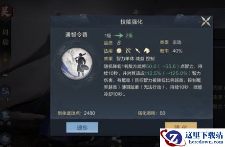 该武技是一个兼并控制与输出的单体武技,并且附带- - -定的减智效果,武技本身可联动减智比例来提升控制几率,如果在面对一些弱智武将的情况下很容易将其眩晕。这里可提供一个猜想,该武技计算减智比例的方式如果是根据武将本身智力来进行计算,那么它的控制加成几率大多数情况只对武力型武将有较好效果,如果是以该武将被减智的当前智力值来计算,那么该武技的控制几率将有更多种提升思路。