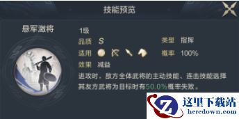 效果介绍:属于指挥技能,开局发动全程有效,该武技在进攻时可让敌方全体武将的主动技能、连击技能选择其友方目标时有概率失败,这里.需要注意“友方目标”是指敌方的友军,并非是我方友军。举个例子,当敌方辅助发动恢复技能,在选取某个武将为目标时有概率选取失败,便不会为其恢复兵力,属于克制带有队伍增益、恢复的技能。