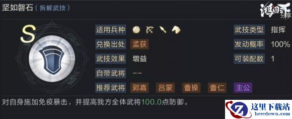 指挥技能,开局百分百发动,不但能让携带者免疫暴击,还可提高全体武将100点防御。主公们一般会选择让后排奶妈或前排肉盾优先学习坚如磐石技能,这样可以有效防御“辕门射戟”等依靠暴击打伤害的技能,对“暴击张”(张飞+曹仁+辅助)、“水鬼队”(甘宁+孙权+孙尚香)等核心思路是暴击追梦的队伍非常克制。