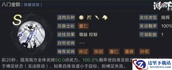 该技能一般推荐给后排或是承伤前排携带,因为自身也会陷入缚足,给后排工具人或前排承伤影响不大,如曹仁、董卓等承伤前排,或是孙权、曹操等buff工具人。