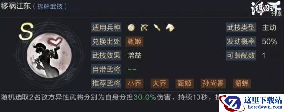 因为选取目标是以全场为基础,携带者异性为目标。考虑到鸿图目前武将的性别比例,该技能只适合女性武将携带,并且需要作为前排的女性武将。所以移祸江东技能只推荐两个人选,大乔和小乔。大小乔自带的武技具备一定的防御效果,通过东吴飞琼组成的妹妹队就非常强力。